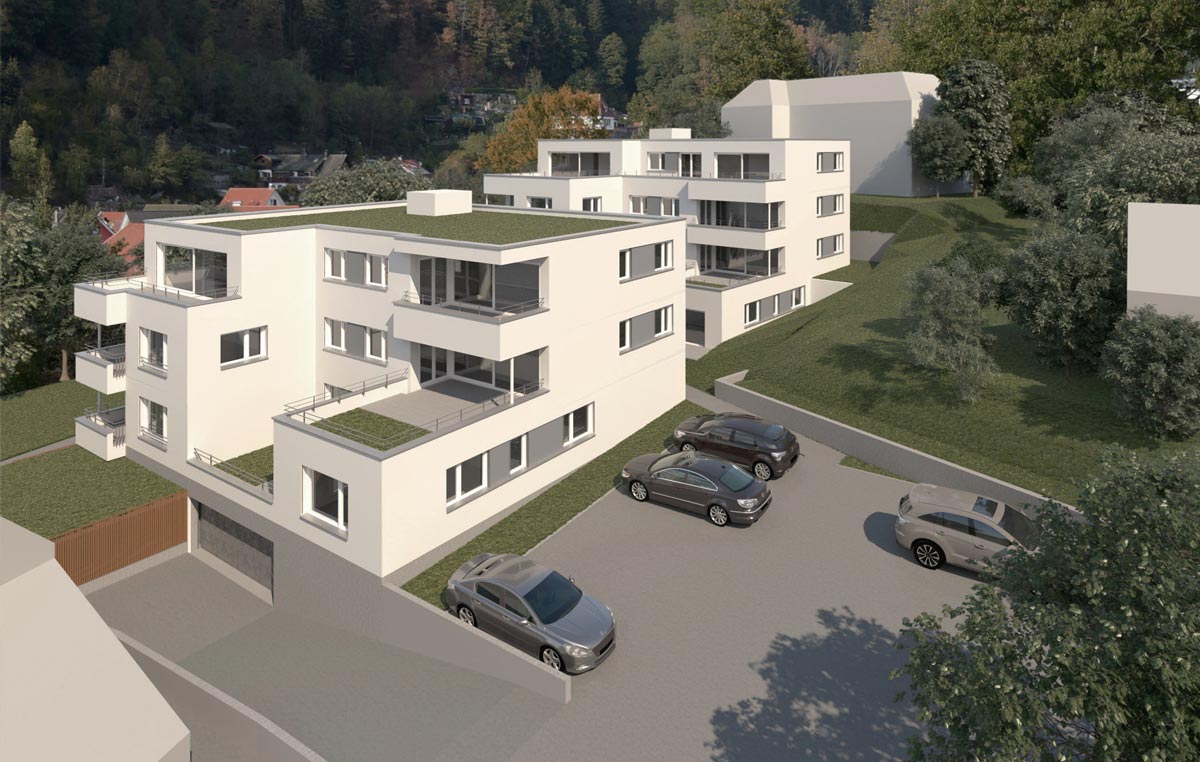Am Rande des Stadtparks entstehen zwei Mehrfamilienwohnhäuser mit gemeinsamer Tiefgarage. Die Wohnhäuser sind in modernem Flachdachdesign geplant, damit sie sich optimal in die Nachbarschaft einfügen. Sechs altersgerechte und barrierefreie Wohneinheiten entstehen im unteren Haus, acht im oberen.